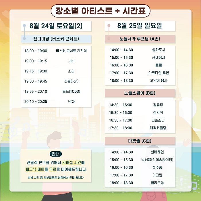 8월 마지막 여름밤 노들섬에서 석양과 함께 공연을 즐기는 것도 좋은 추억이 될 듯 합니다.