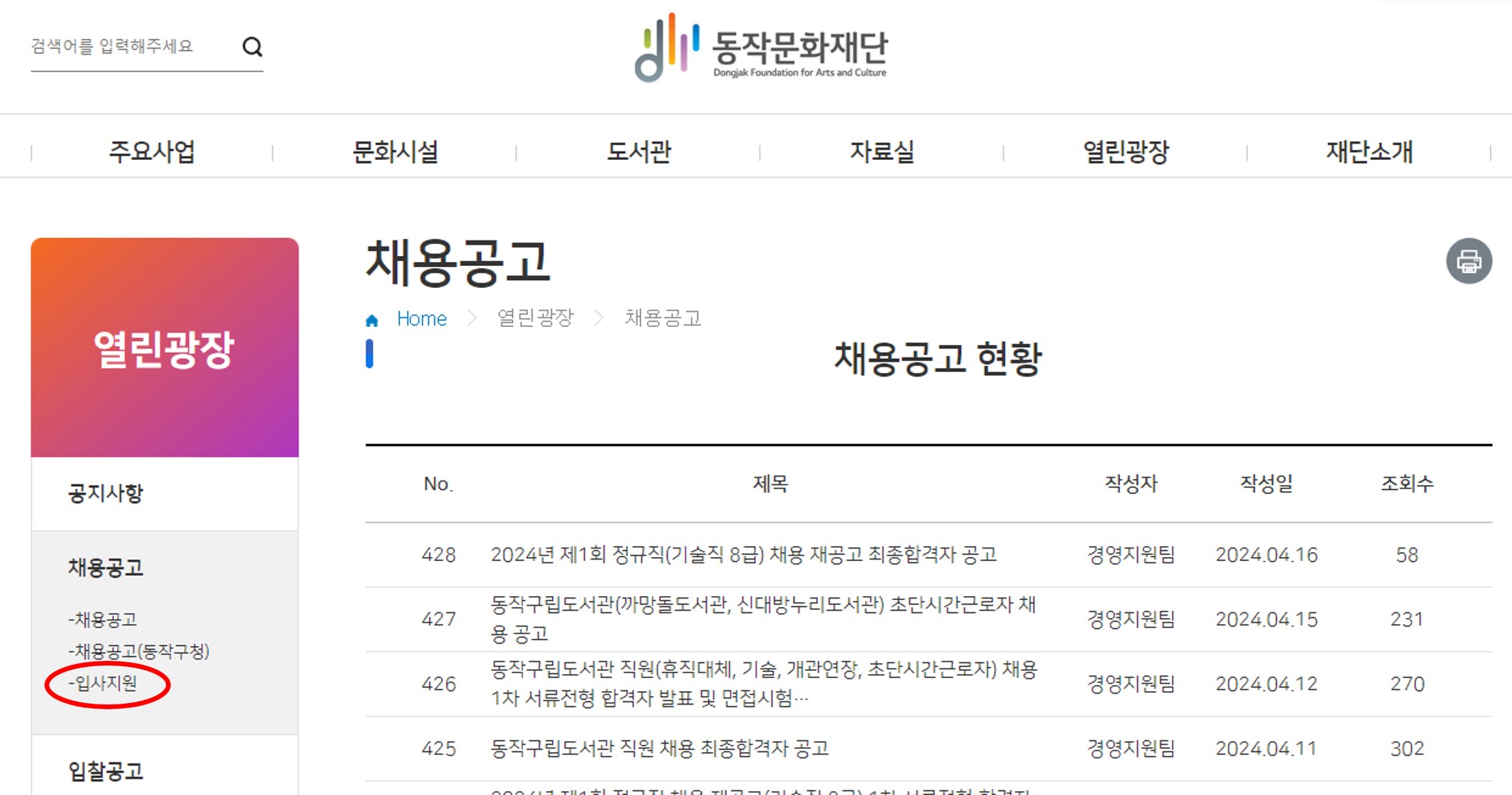 열린광장 ⇒ 채용공고 ⇒ 입사지원 ⇒ 실명인증 ⇒